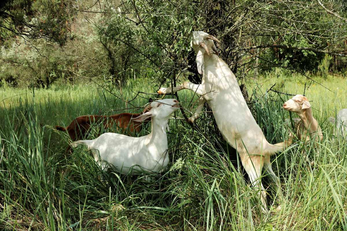 In a perfect setting, goats would spend most of their day browsing. Unlike cattle, goats naturally prefer leaves, shrubs, weeds, and woody plants over straight grass. This is why you often see them reaching up into brush or stripping leaves instead of grazing low to the ground. Browse provides a diverse range of nutrients and is what goats are naturally built to consume.